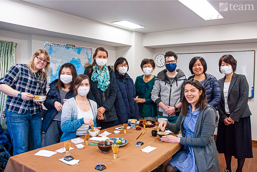 Missionaries in language school learn both communication and culture. Erin (front right) and Nick (third from right) enjoyed a tea ceremony with their class. Photo courtesy of Erin Petkoff.