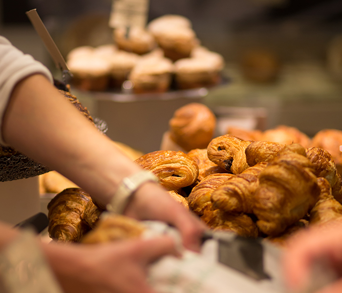 A French woman picks up a roll from a bakery display