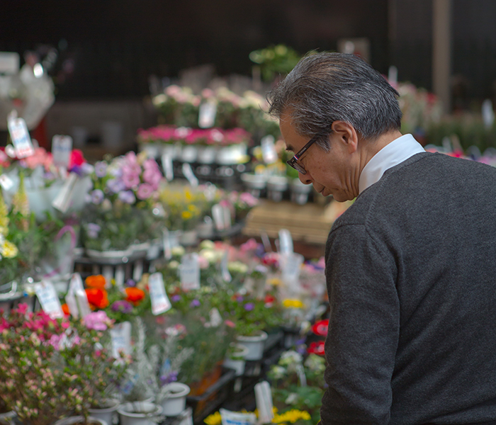 A Japanese man looks at a display of flowers