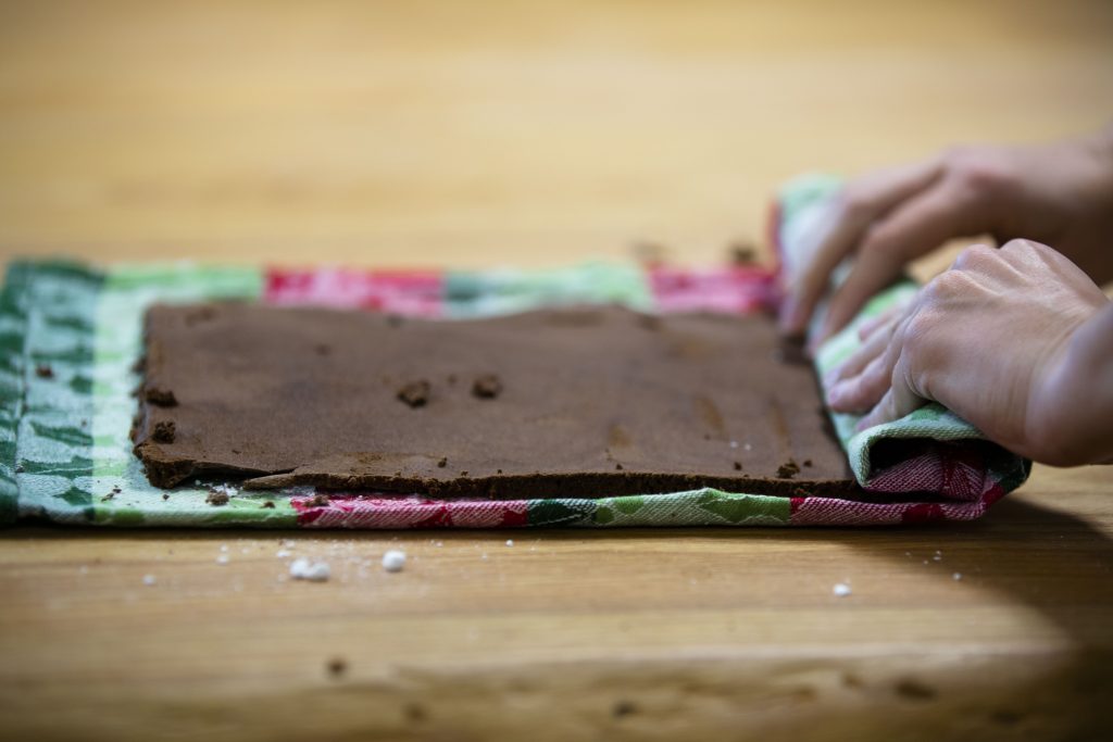 1. Dust a clean dish towel with confectioners sugar. Run a knife around the edge of the pan and turn the warm cake out onto the towel. Starting on a short side, roll up the cake with the towel and allow to cool.