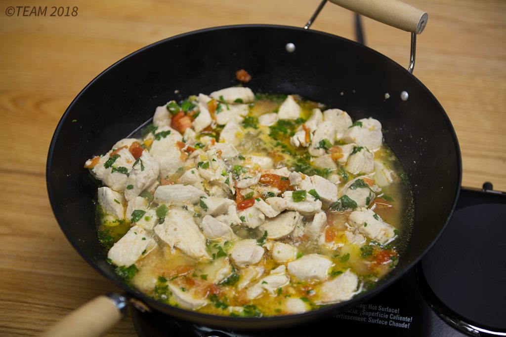 4. Add remaining tomatoes, green chilis and cilantros, and heat through.