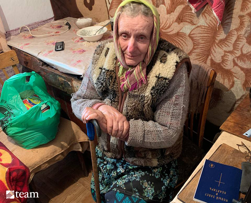 One example is the woman pictured below. “She lives alone and had no money for food,” Maria shares. “The day my team visited her, she was in the kitchen praying and asking God to help her. Our team gave her food, a New Testament, and prayed with her.”