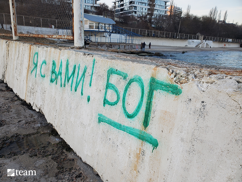 A graffiti wall on the outskirts of Odesa reads “I’m with you! – God”