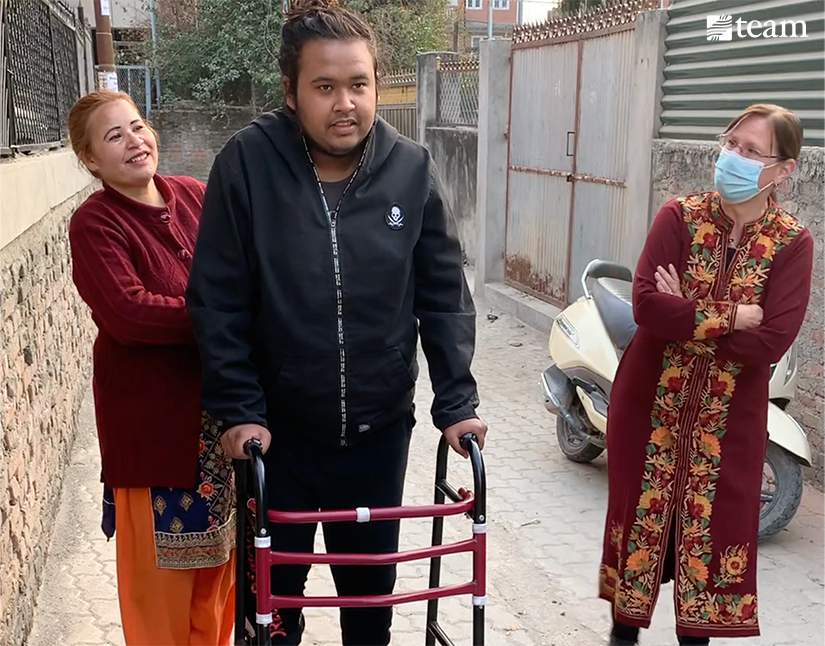 Cindy also asked Joelle, one of her TEAM co-workers who is a physical therapist to visit Nabin with her. Joelle found that Nabin’s muscles were deteriorating from lack of use. She showed Nabin exercises to do, and she prayed with him.
