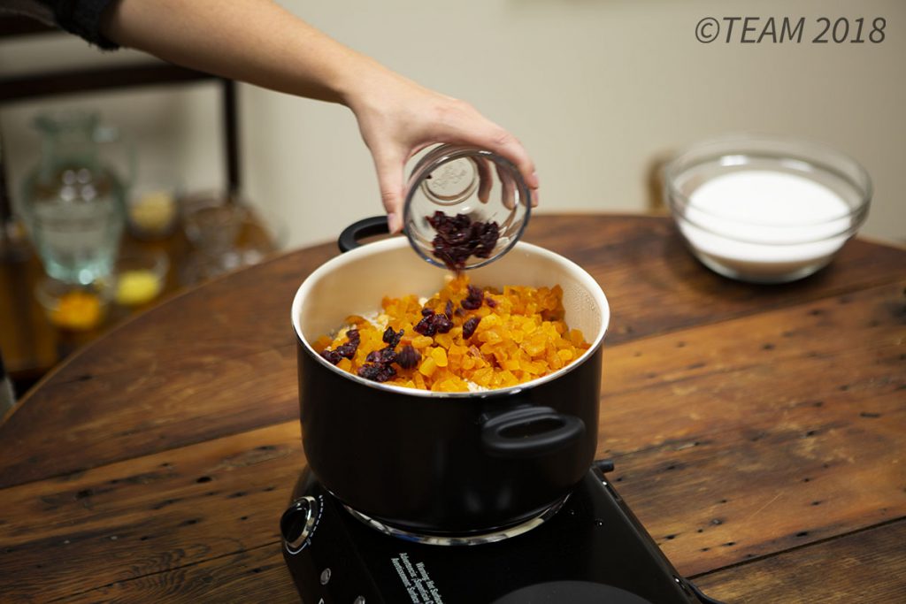 4. The next morning, the grain should have absorbed most, if not all the liquid. Add the chickpeas, beans, rice, dried fruits, sugar and optional rose water or orange, and lemon zest.