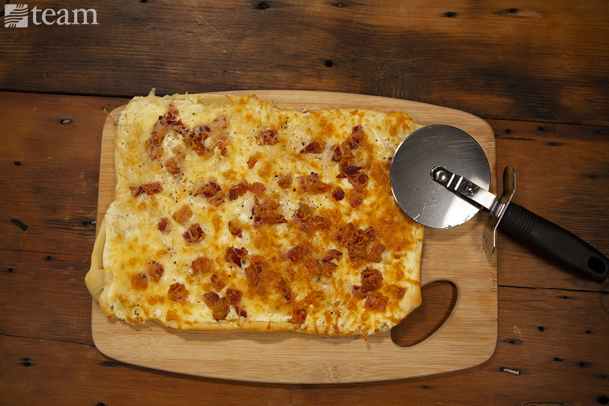 Back in the day, German farmers would bake bread once a week. To test the oven temperature before they baked bread, they would put this small assortment of bread, creme fraiche and cheese into the oven. And that creation eventually evolved into what we know today as flammkuchen, or “pie baked in flames.”