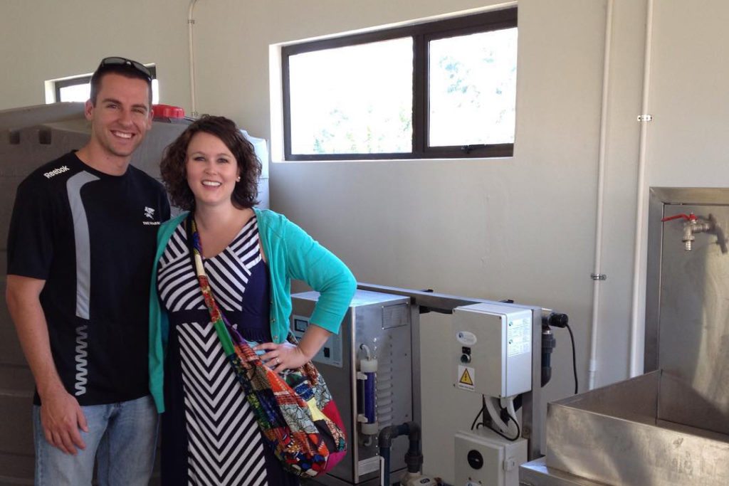 Brett and Kara, posing in the water bottling plant, hope the project’s impact returns more than just funds. Photo courtesy of Brett and Kara Richstone